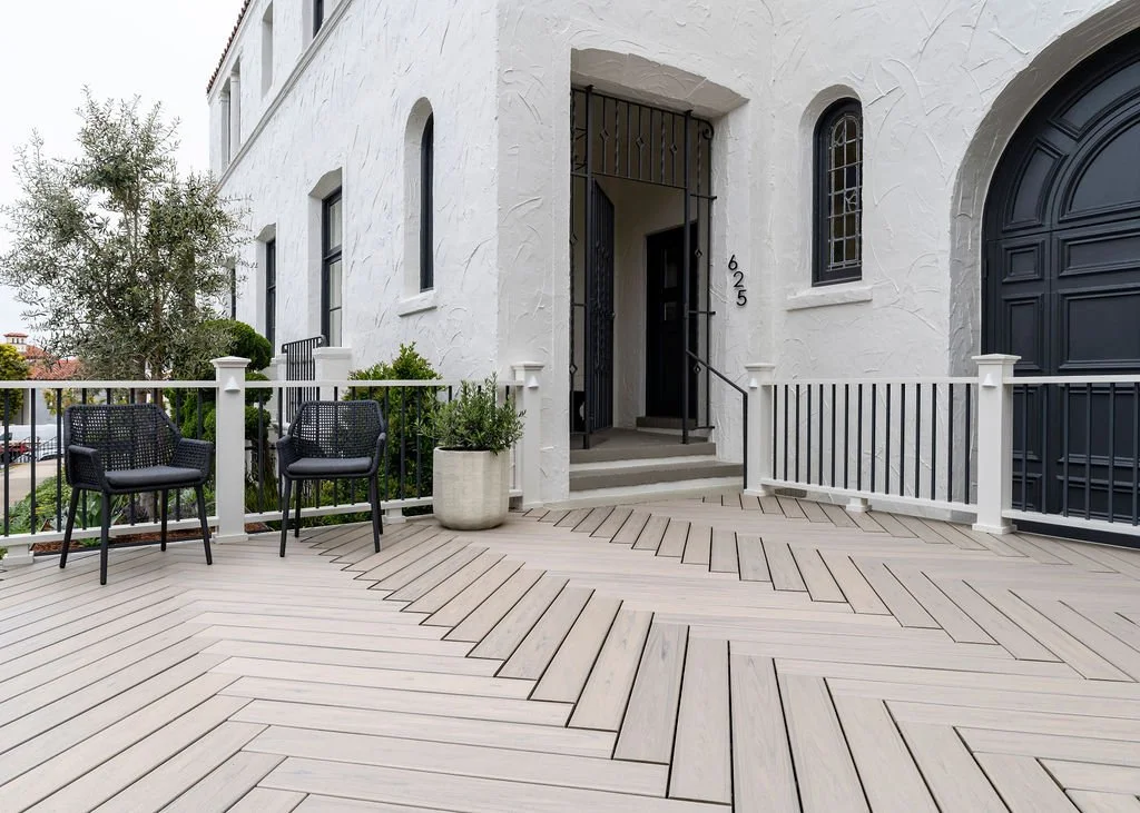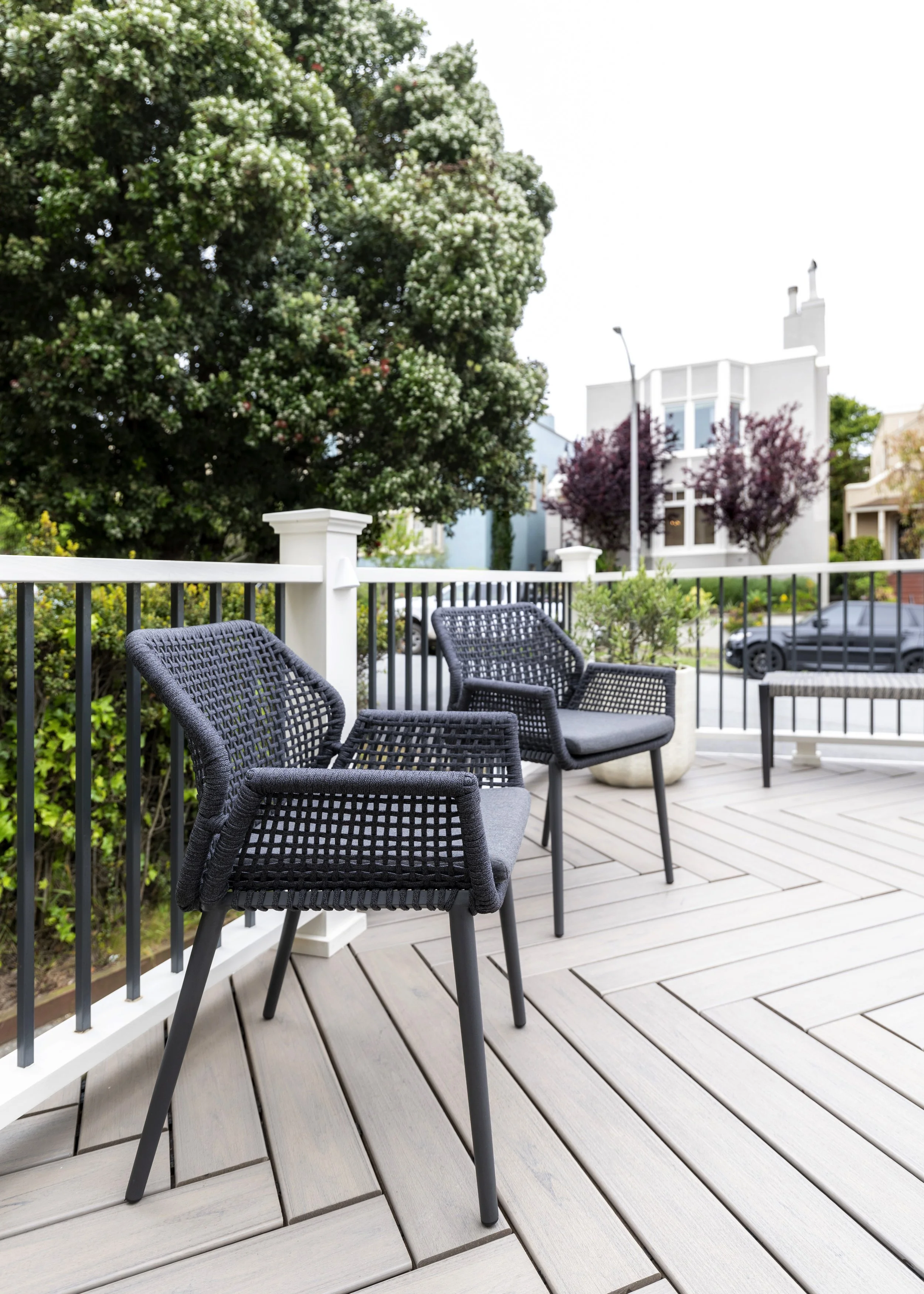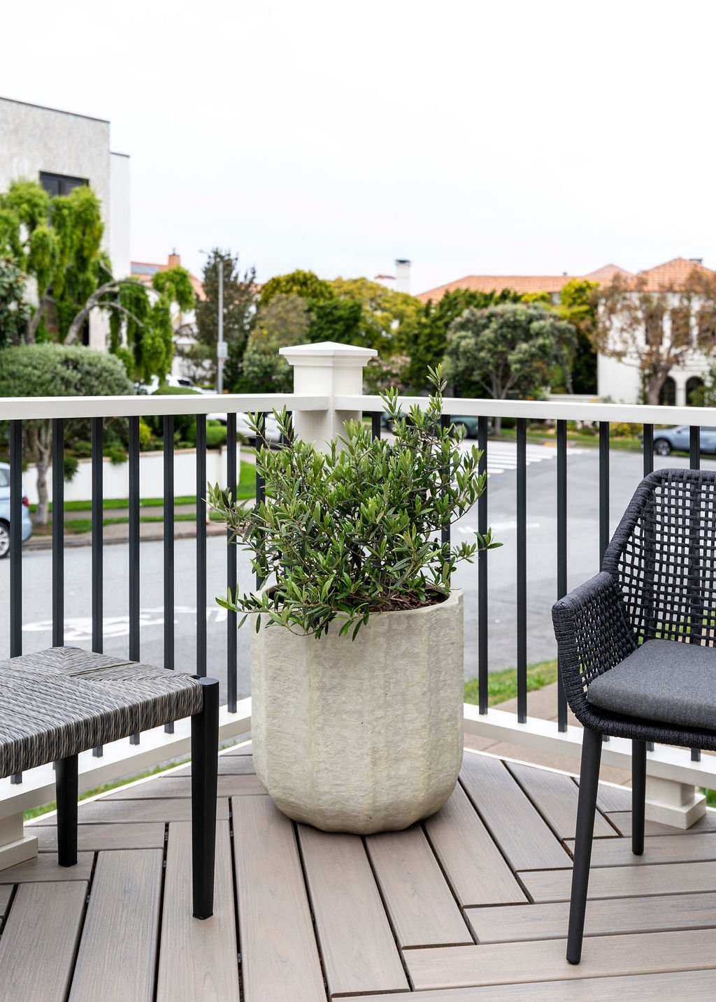 When asked to partner with a beloved contractor and friend for the annual SF Decorator Showcase, we didn't hesitate to join the team! Tasked with creating a temporary outdoor landing and lounge space meant to double as a reception space for guests as well as a bar and lounge area for parties, we wanted to make a bold impact while also remaining in line with the house's existing aesthetic. We designed and constructed a deck space using high quality materials and fixtures to create a seamless transition from the house to the outdoor space. The highlight? The herringbone patterned composite decking. Our partners, Perez Construction, perfectly executed our vision for this anything but temporary looking space.